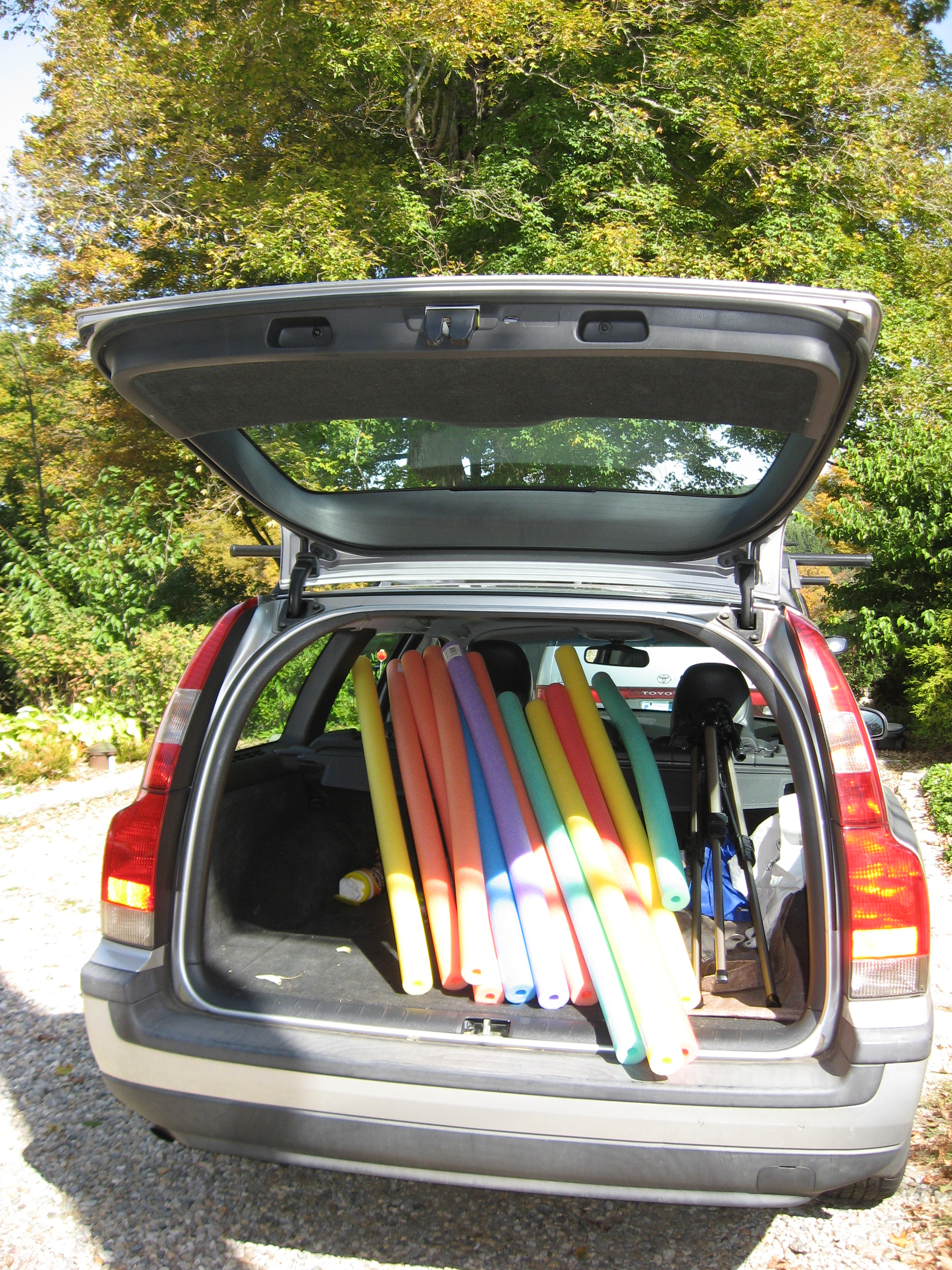 Like many of you, I usually fold my large bed size quilts before storing. As expected fold marks appear even though as suggested, I would refold them in different ways when not being used for a long period of time. That changed when I started creating pieces in my studio that were meant to be a visual presentation to be hung on a wall. Rolling them for storage meant that those fold lines were eliminated. The best product that I have found to roll my artwork are those colorful foam tubes that appear in stores like WalMart and CVS when the weather warms up. This photo shows a pile of those tubes that I purchased from CVS last Fall.