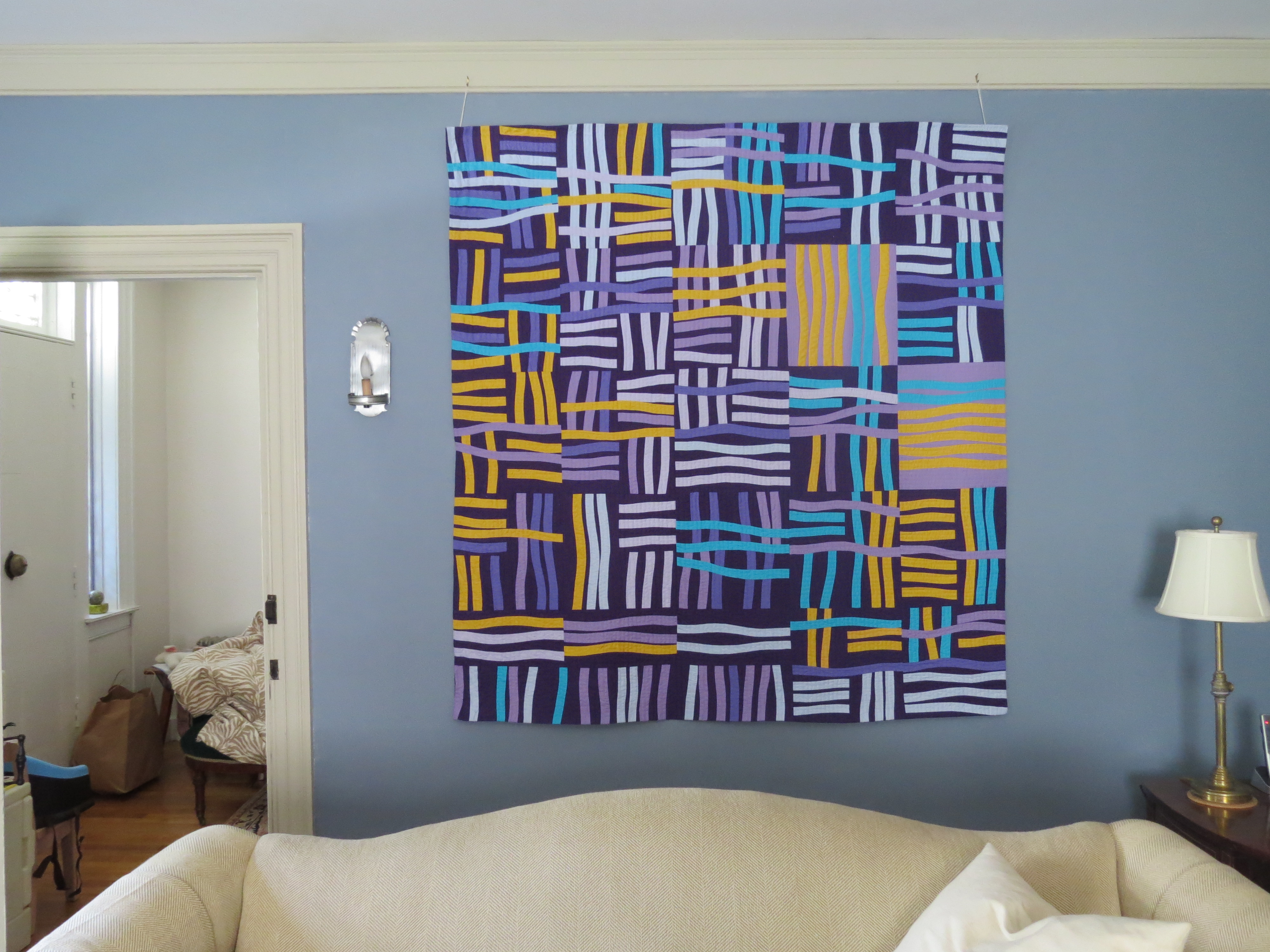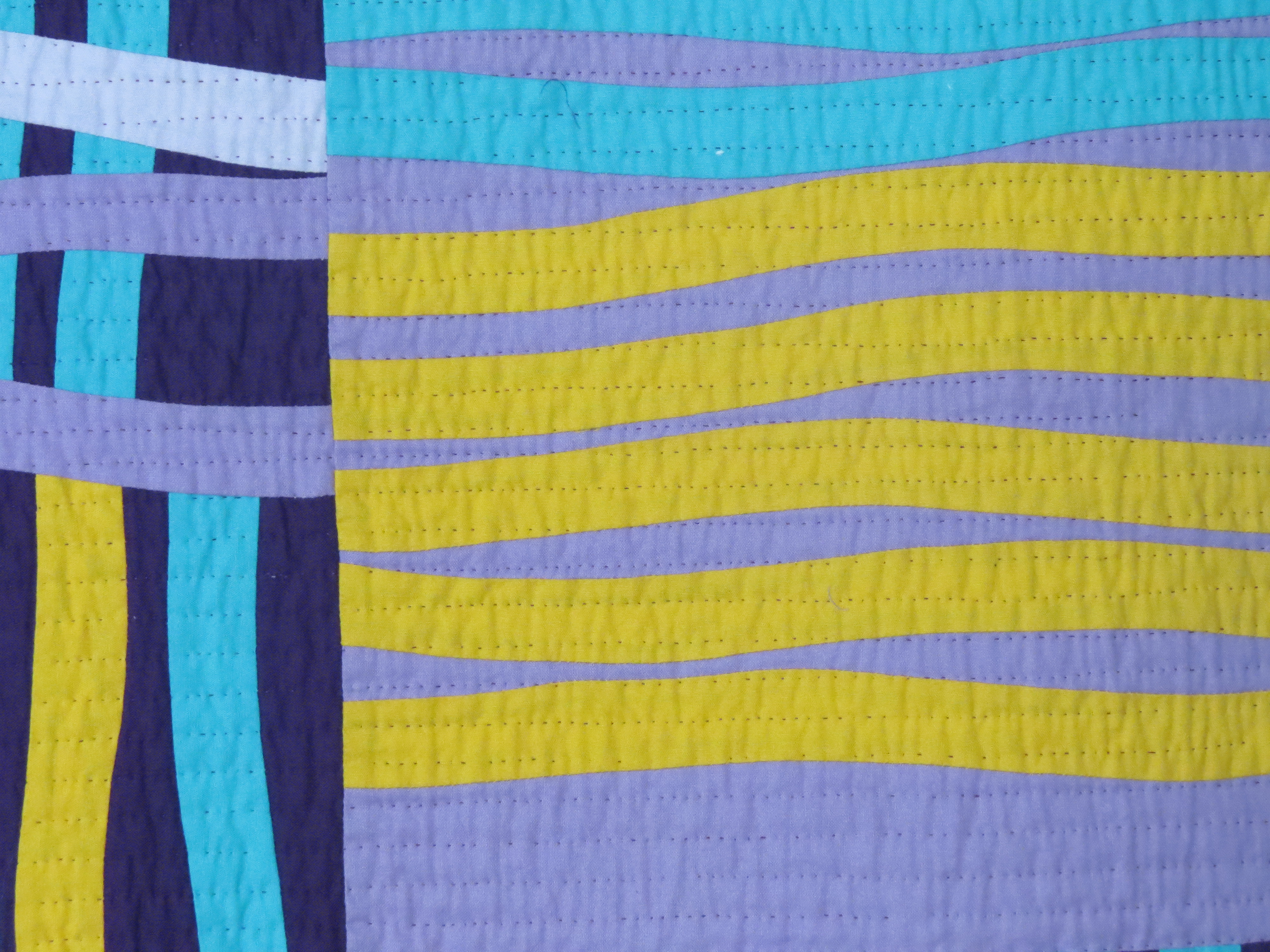 Did you ever look at a piece of art photographed in a book and then when you actually saw it’s real size wondered why it was so much bigger or smaller than you had imaged? Since many of us have a frame of reference that quilts are bed size it may be hard to imagine that many present day Art Quilts can have a much smaller or larger real size. Many of my line pieces start out small and then “grow” as I start to assemble them. The movement of the curved lines across the surface of the quilt encourages me to create more and more of this movement. In Gold Hay #6 the piece grew to a finished size of 60Hx60W inches. Shown below it is hard to tell it’s real size;