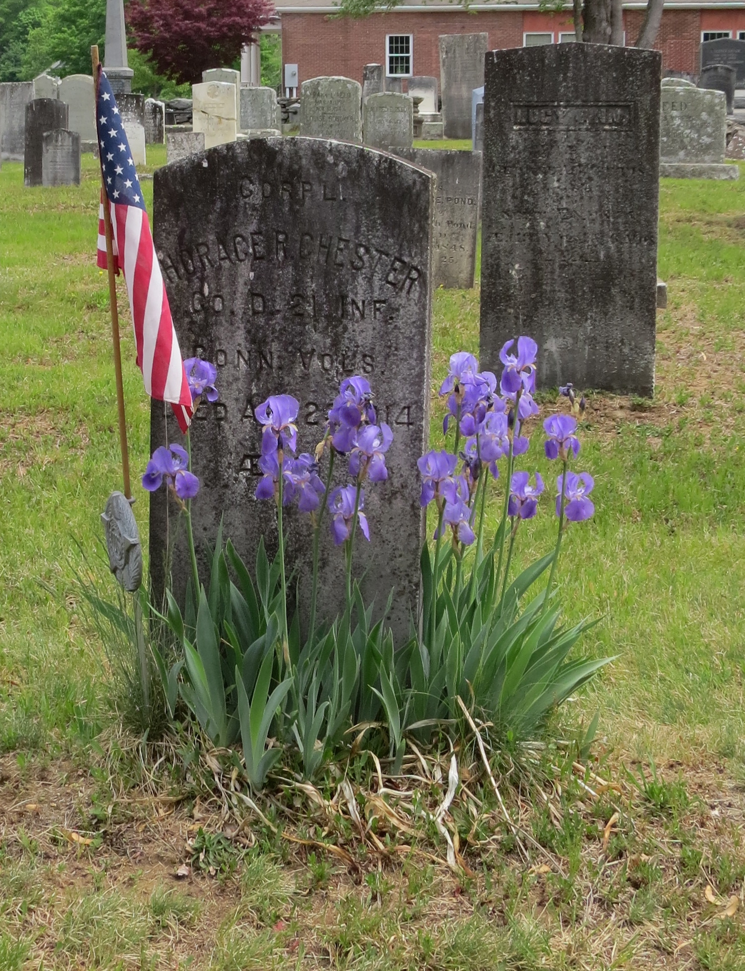 Our home is located to the south of the Old Store on Chaplin Street, and “was built sometime between 1828, when Isaac Goodell bought an acre and 17 rods from Luther Ripley for $125 and 1835, when Isaac sold the same land “with dwelling house and merchant store and shed” to his brother, Walter Goodell, for $2500. Our house is one of the best examples of Greek Revival architecture on Chaplin Street and is a good example of the transition from Federal to Greek architectural style in New England villages. The sidelights and oval attic window are typical of the Federal Style, while the free-standing fluted Doric columns, which support a portico, are typical of Greek Revival architecture.” (Historic Homes of Chaplin Village by Johanne Philbrick, pg. 11) At the end of the Chaplin village is the local cemetery, which has many wonderful gravestones that remind us of our history. Here is one of those stones ready for Memorial Day 2015.