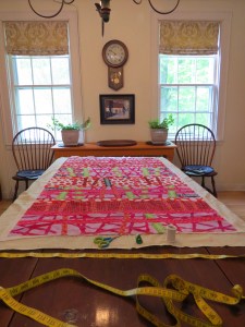 Today, on June 27th – just 2 months later I am happy to share that the piece is complete!! The fabric for the back has been selected and the three layers (top, batting, and back) have been basted together on a flat surface, actually my dining room table. Lining up the middle of the top and the center of the back are key to my signature hand quilting technique. This technique uses the printed design as my guide lines for my hand stitching. Lois Palmer, a certified quilt appraiser is in the process of appraising it before I send it on to the New England Quilt Museum (NEQM) in Lowell, MA. The first opening will showcase 12 of the 24 selected artists on October 13th, 2018; and the second opening has been moved to April 6th, 2019. The timing of the completion on my piece is perfect. I will be heading down to the R. I. shore for a week and to celebrate the July 4th holiday. Oh, and I just packed something to hand quilt while sitting on the beach. Happy Independence Day! It’s going to be a GREAT ONE!