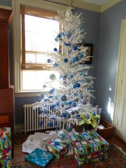 The color BLUE is working it’s way onto my studio design wall. Blue is obviously the theme for the Smith’s Christmas tree this year. Last year’s fake white tree has been taken out of the attic – a variety of BLUE Xmas balls were purchased and hung – some silver ornaments were added – DONE!