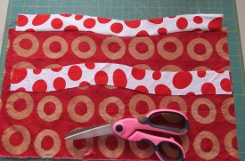 #1 – The fabric piece with red dots on a white background has been laid on top of the background fabric.