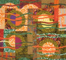 Presently our swirling tree leaves in Connecticut are also  going, going almost gone.  My piece “Autumn Swirls” completed years ago echos that sentiment. Interesting to me that the tablecloth fabrics in”Dementia” seem to be from the same color palette as my 2009 piece. So my question now is “Were we purchasing fabrics in different countries at the same time?”.