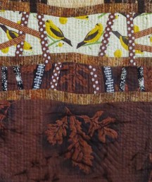 STUDIO NOTE:  The theme of leaves is highlighted  in “Hay . . . Keep Your Distance #5”, titled “Mighty Oak Leaves”  as it incorporates printed oak leaf fabric into the design (detail shown right).