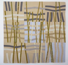 During the many years of hand quilting my Fiber Art, I came up with a simple way to hand quilt each piece. Using a 14 inch hoop – the 3 layers are held together with the back of the quilt on the top surface as shown below left and right. By hand stitching along the printed lines, or the spaces between, I do not need to draw any pencil lines on the piece.
