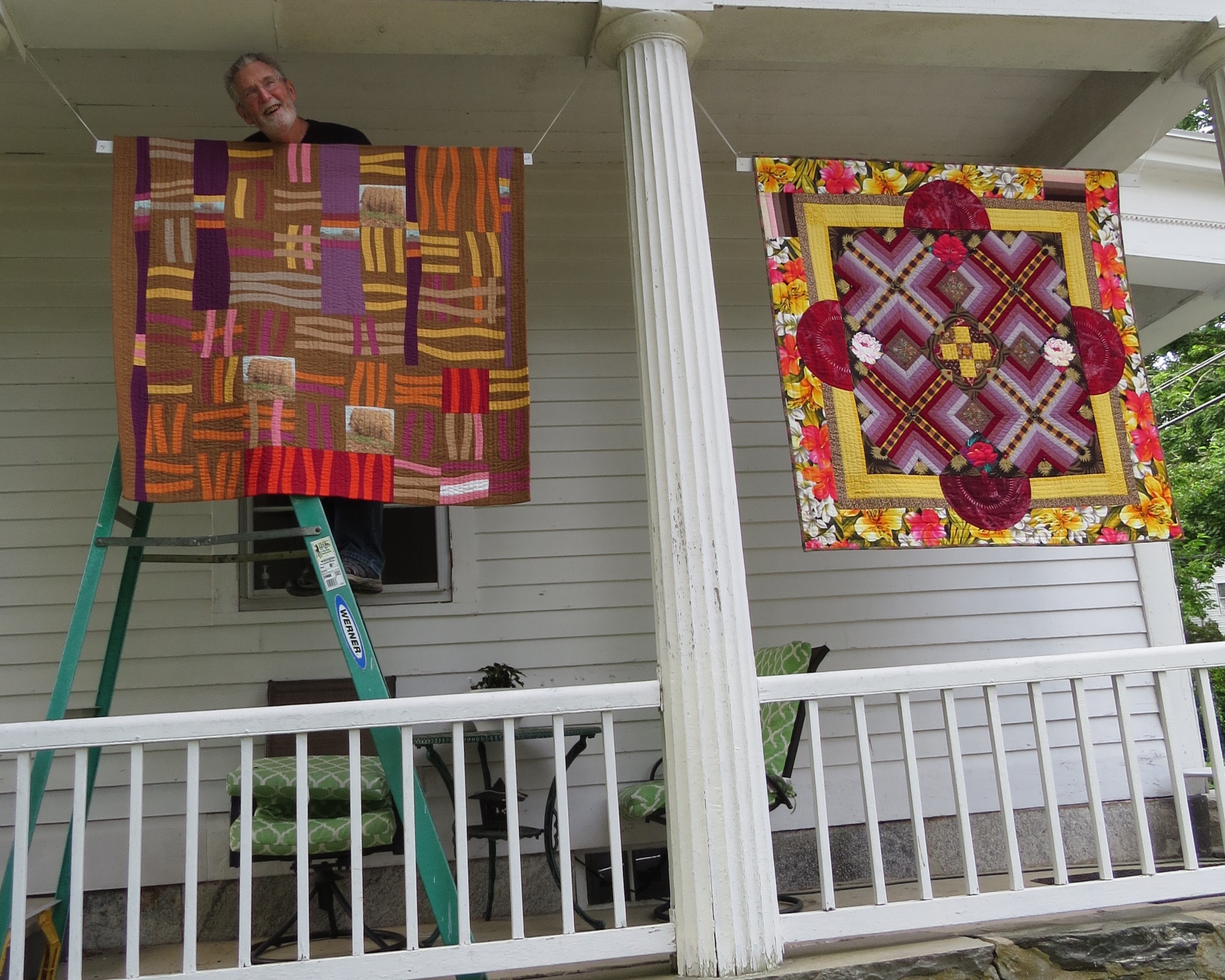 Below is a picture of my husband Steve hanging my two pieces. LEFT is “Heating Up the Hay” (c. 2010) and on RIGHT is “Where the Red Moon Rises’ (c. 1991). I think the color of both pieces looks great, even though they are over 10 – 30 years old. So which quilt will you be hanging today? Stay Safe . . . Smith Stitch Studio
