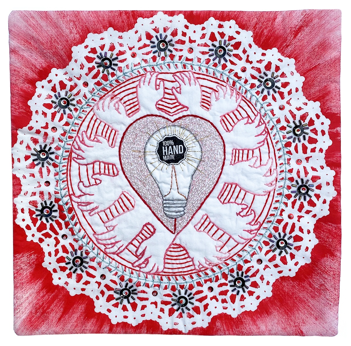 If you are looking for something smaller (12H x 12W) in an Art Quilt why not check out the SAQA 2021 Benefit Auction. The biggest fundraiser every year for SAQA is also a great opportunity to pick up small quilts (12 inches square) by exciting art quilters at reasonable prices. The auction runs September 10 to October 3. Go here to see the 470 quilts and register to bid. For Section #1 – Go to https://www.saqa.com/auction-section1 . One of my favorites in section#1 is shown below.