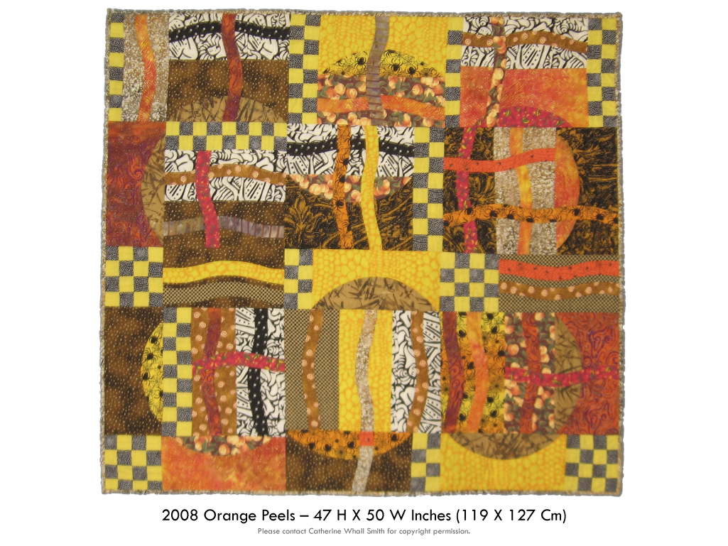 Right now it is hanging on a wall so that I can study it’s details and fabric choices. It will eventually hang in my ‘She Shed’ during Open Studio, and maybe find a new home. Machine Pieced, and Hand Quilted it measures 47H x 50W inches – so it will fill a large space.