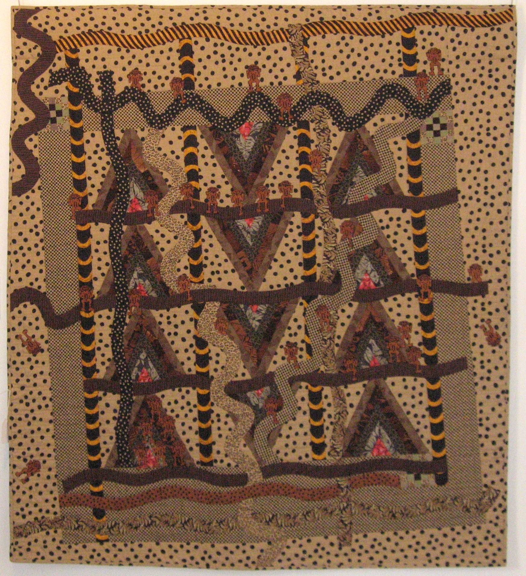 One of a Kind Original Design by CWSmith Machine Pieced. Hand Quilted. All Cotton Materials.In 1993 “ Pain” (60H x 54W) was juried into “Materials: Hard & Soft Exhibition”, at the Greater Denton Arts Council, Denton, Texas. – It now hangs with the 12 x 12 mounted fabric photo of The Isaac Eaton House, c. 1840 @19 Chaplin Street, Chaplin, CT. at the Chaplin Library.