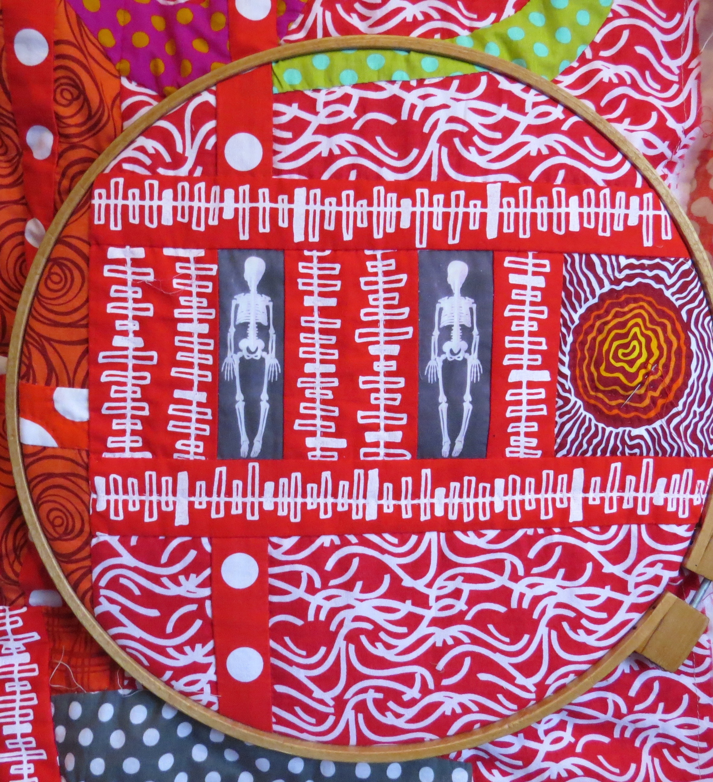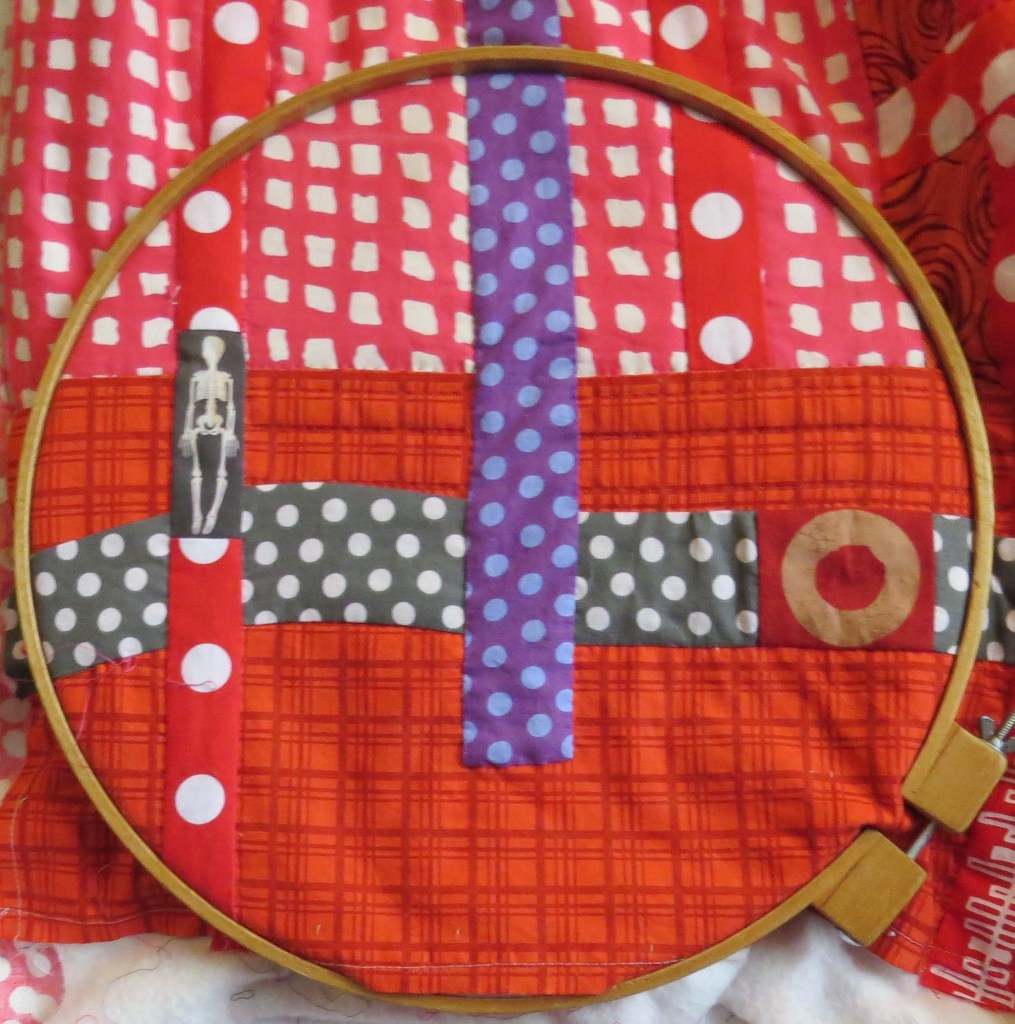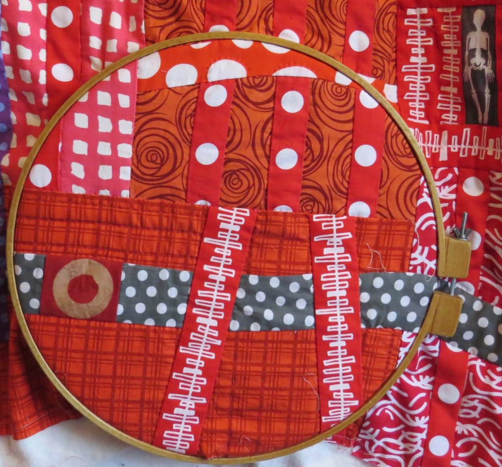 Below is a detail image of my latest “Transfusion” series piece. I have learned a lot since executing #1. As I hand quilt sections of this piece, in my 14 inch hoop, I am struck by the smaller “PARTS” of this piece. Here are a few examples.