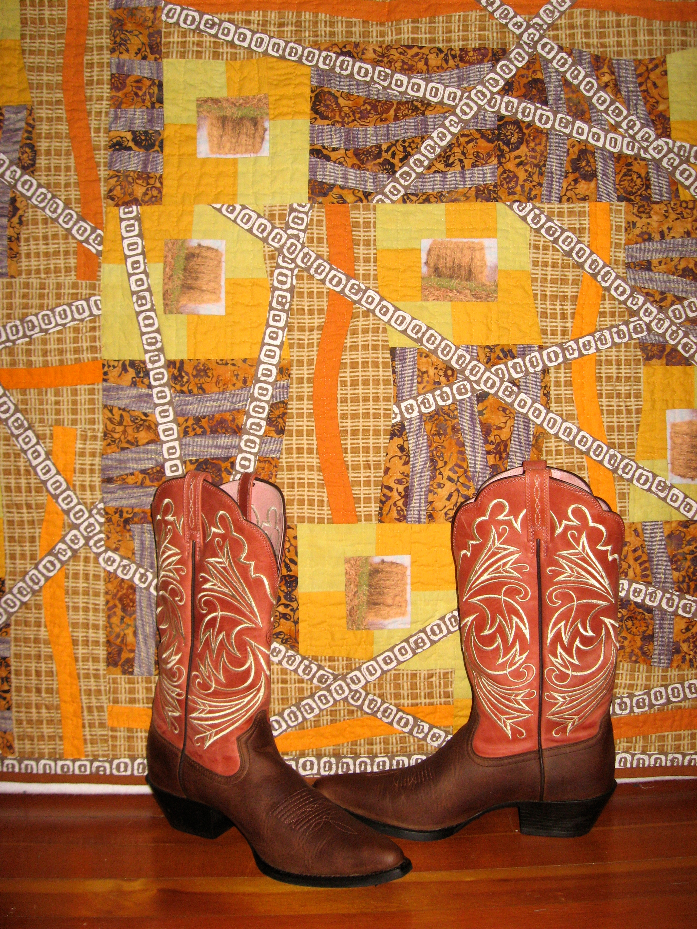 This piece that includes my photo images of the “marshmallows” and hay bales that I view while driving by the local farmlands near my home/studio was just sent off to meet the early deadline for the Fall 2012 SAQA One Foot Square Auction. Titled “Twins with Matching Hats” (12H x 12W inches) it is made of all cotton materials, some vintage fabrics, and is hand quilted. The September SAQA Auction is a wonderful opportunity to purchase fiber art priced from $75 – $750. More details on the viewing of all the works on line and the bidding schedule for this fundraiser will be posted on my blog sometime during the month of June. So is it time to start saving up that “Green Stuff” – what do you think!