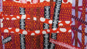 Now on to selecting the fabrics for the back of the piece, which I’ve decided will incorporate fabric shapes of my 1974 pants pattern. (I will explain the 1974 pants pattern in another post.) So far so good with that – though I’ve already spent 5 days in the studio on the back of the quilt. – Needing a studio break I just dressed one of my mannequins with a T-shirt I received from the University of Connecticut. It was a gift for entering one of their on-line challenges. The Benton Museum Challenge – asked members to recreate a work of art. Basically they were looking for art that referenced something in their on line archives. I found the Fox II (1972) (33.5 x 37.3 cm) image shown below right by Anni Albers (aka Annelise Fleischmann Berlin, Germany, 1899 – 1994), and thought my “Joined by the Hand Cuffs” and “Burning Embers” (below left) had a similar format. Check out all The Benton Museum has to offer at https://benton.uconn.edu/.