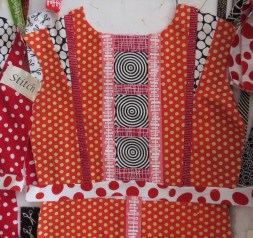 As “Transfusion #12” (the dresses) gets larger and larger – I realized that the weight of the quilt will compromise the stitching of each of FOUR separate border pieces on each of the sides. So my solution was to “Join Borders” and stitch the 4 borders together and then attach to the larger piece. Below the start of that process showing 3 strips being laid out and pressed after each border is attached to the next.